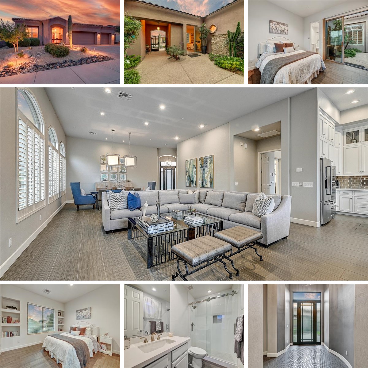 Stunning View Property in the Popular North Scottsdale Community of McDowell Mountain Ranch. The current owners worked with an Interior Designer adding luxury features not found in similar models. Enter through wrought iron gates into a courtyard with access to a private casita & bath. Admire beautiful mountain views while relaxing in the large Great Room accented with a granite top bar & fireplace. Kitchen features a metal accented hood, accent backsplash tiles & custom white cabinetry. Spacious Owners Suite with a Therapy Steam Shower! 2nd Bedroom w/private bath + and extended 3rd bedroom/bonus room & 1/2 bath. Enjoy AZ living in the backyard featuring City Lights, Mountain views & Pavers. Entertain at the elevated seating area w/ fire pit & BBQ or enjoy a swim in the pool & spa
