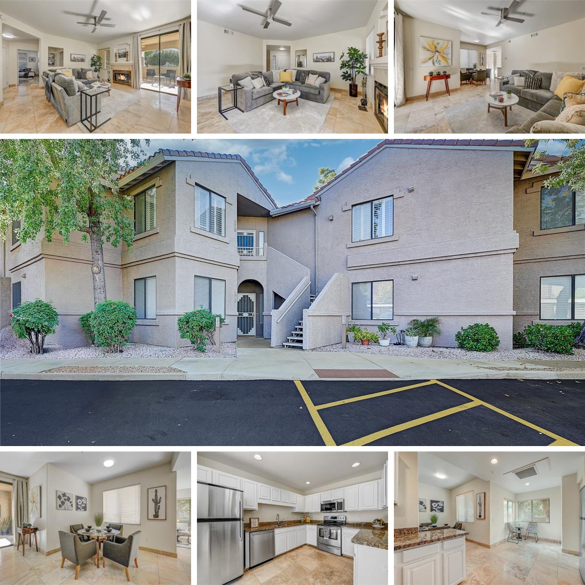 Live in the heart of North Scottsdale, close to shopping, restaurants, freeway access & events. This spacious bottom floor condo features 2 Large bedrooms, 2 baths AND an extra bonus room, great for a home office, play room or an additional bedroom for guests. Updated with beautiful travertine flooring in all major walk-ways, new carpeting in both bedrooms, new ceiling fans, travertine accented showers & more. The kitchen features granite counter tops, white cabinets and recently updated stainless steel appliances. A new HVAC system was installed in 2022 & the complex was recently re-roofed. Also enjoy a spacious back patio with storage closet. What's extra nice is a back gate leading directly to a large grass area, great for pets. Gated community w/community spa, pool & walking paths.