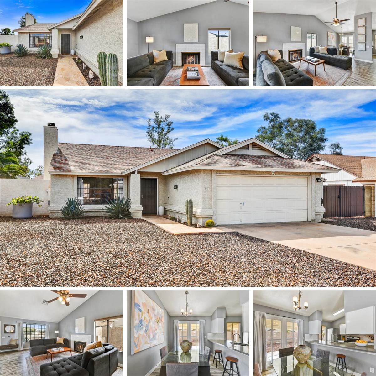 This charming, updated 3 bedroom, 2 bath ranch-style home with a 2 car attached garage is nestled on an expansive lot, complete with an RV gate and mountain views, within the desirable Paradise Valley School District. A picturesque flagstone walkway gracefully guides you to the inviting front entrance. The home boasts soaring vaulted ceilings, elegantly updated plank tile flooring, an abundance of natural light, and a cozy wood-burning fireplace that adds warmth and character. The modernized kitchen is a culinary delight, featuring updated white cabinetry, luxurious quartz countertops, and stainless steel appliances, creating a perfect blend of style and functionality. The primary suite is a private retreat, featuring a spacious walk-in closet, a beautifully appointed ensuite bath, and a sliding glass door that opens to a covered patio overlooking the side yard with sunset views. The additional bedrooms are thoughtfully designed, each equipped with ceiling fans, generous walk-in closets, and large windows that flood the rooms with natural light. The expansive backyard is an entertainer's paradise, offering multiple covered patios, a wood-burning fireplace, majestic palm trees, a turf side yard, and access to the RV gate. This property is designed for low-maintenance living and is situated in a prime location that provides easy access to local shopping, dining establishments, the greenbelt, and multiple parks for outdoor adventures, including hiking and biking.