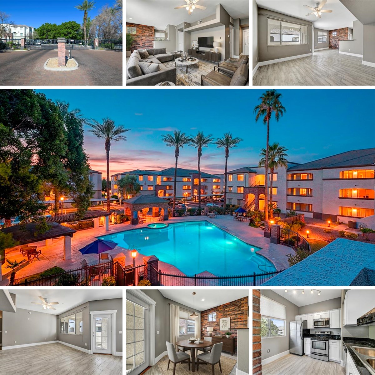 Wonderful condominium in the gated Brick Commons community with resort style amenities and a true midtown lifestyle! This beautifully updated home features a remodeled kitchen (2026) with new cabinetry and granite countertops, plus a long list of upgrades including a new HVAC (2022), tile flooring (2024), new baseboards (2026), and fresh interior paint on ceilings, doors, and trim (2026). A reverse osmosis filtration system and elegant crown moulding add comfort and character throughout. The spacious living room opens to a private balcony with an attached storage room, perfect for relaxing or entertaining. The split-bedroom layout offers two primary suites: one with pool views and the other with direct balcony access, both with full baths, freshly painted cabinets, and walk-in closets. One car garage and convenient laundry closet with washer and dryer included. Enjoy Brick Commons' heated resort style pool and spa, ramada, BBQ areas. Enjoy the clubhouse with fitness center, putting green, billiards, cinema, and business center. Prime location close to dining, nightlife, shopping, golf courses, sports venues, public transit and bus stop, University of Arizona Medical School, Phoenix College, and ASU (downtown campus), this is urban living at its best!
