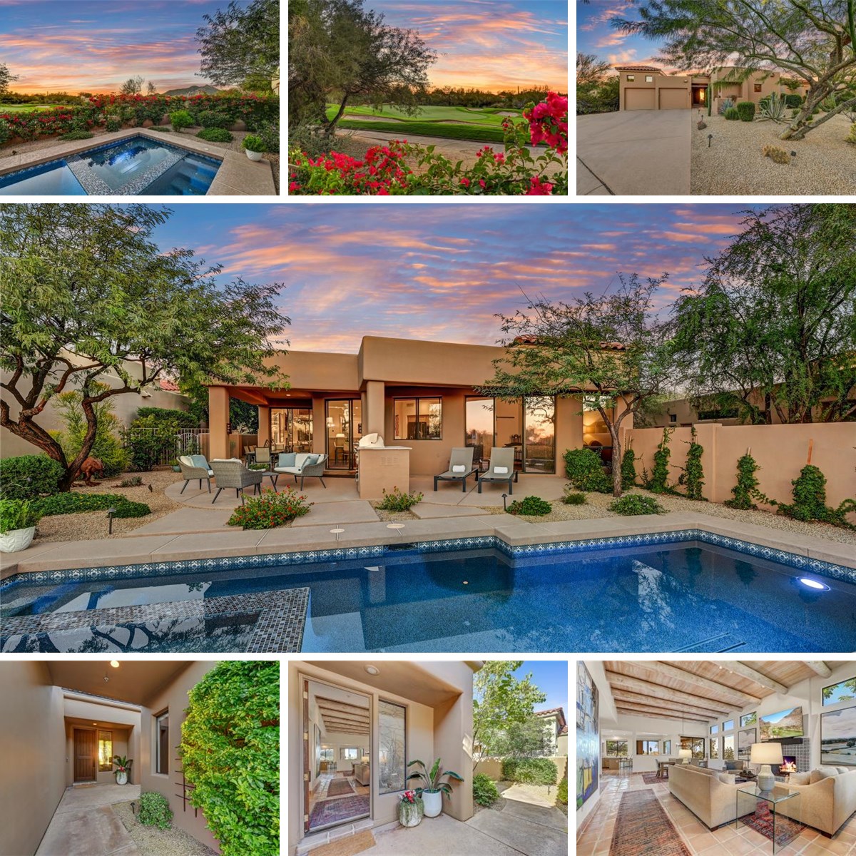 Nestled within the world-renowned gated golf community of The Boulders, on the highly sought-after Fifth Green, this home boasts luxurious updates throughout. Upon entering, you'll immediately feel as though you've stepped into a meticulously maintained resort villa. This stylish southwest contemporary home is bathed in natural light, featuring high ceilings adorned with crisp whitewashed beams, sleek white walls, large windows and glass doors with modern window coverings. The ambience is complimented with warm finishes such as blush Saltillo tile floors and a classic Mexican tile fireplace surround. The 2,004 sq. ft. home features 3 bedrooms and 3 baths, a semi-detached casita, and a 2-car attached garage. It also boasts a newly renovated expansive resort-style backyard with a modern pool, spa, patio for dining and lounging areas, a built-in BBQ grill, and lush landscaping with stunning golf course, mountain, and sunset views. Additional updates include a new roof, HVAC system, landscape irrigation, landscape lighting and backyard privacy wall with block and iron view fence. The open floor plan seamlessly connects the well-appointed kitchen with new appliances, backsplash, and breakfast bar with fresh white quartz countertops to the great room area with casual dining, formal dining and sitting areas. The property is entirely on one level, and every backyard window and patio offers a view or access to the private amenities. This property will allow you to enjoy all that The Boulders Fifth Green has to offer including a community pool and close proximity to the Club. The Boulders Club amenities includes two spectacular 18-hole championship courses, a clubhouse, 12 pickleball courts, 5 tennis courts, a workout facility, club pools, The Spa at the Boulders, and multiple restaurants. Club amenities are available separately. Please inquire with the Boulders Club regarding membership availability.