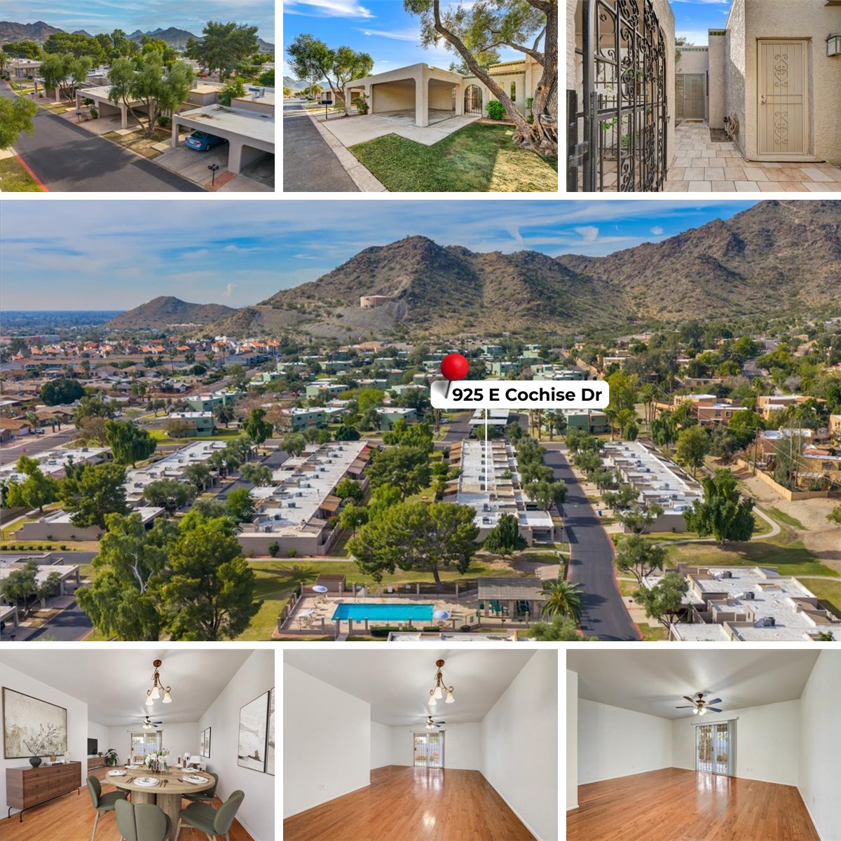Enjoy easy, low-maintenance living in this charming single-story 2-bed, 2-bath condo in Phoenix! Enjoy fruit trees on your covered patio & step out your private backyard gate to extensive green space & convenient walking path, perfect for enjoying desert living. The community pool is just steps away, offering a resort-style feel right outside your door! Inside, the layout provides comfortable living with a great room, well-appointed bedrooms, fresh interior paint & new quartz counters in kitchen & bathrooms. Plus, updated seamless bath tub & shower walls. Surrounded by beautiful mountain views in every direction, this home offers a serene setting while still being close to city conveniences. A perfect blend of nature, comfort & location; ideal for year-round living or a seasonal retreat!
